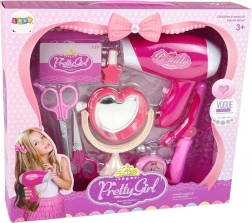 A csomag tartalmaz szívecske alakú tükröt talppal, hajsütővas-imitációt, ollót és kozmetikai kellékeket, amelyekkel a gyerekek új frizurákat és „beauty” rituálékat találhatnak ki. Az összeállítás ideális ajándék 3 éves kortól kis stylistáknak.
