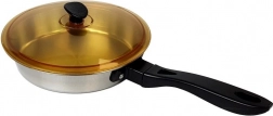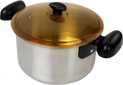 A fazék, serpenyő és további edények rozsdamentes acélból készültek, amelyek valódi konyhai felszerelést imitálnak.