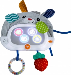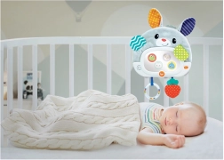 Tükrös nyuszi a kiságyhoz egy plüss játék biztonsági tükörrel, látványos fényhatásokkal és dallamokkal, amelyek segítenek a gyermekeknek az elalvásban és a játékban.