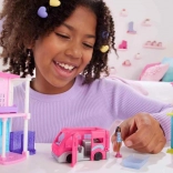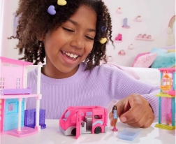 A Mini Barbie Land lakóautó nyitható ajtókkal, részletgazdag konyhával és okosan kialakított belső térrel inspirálja az útközbeni jeleneteket.