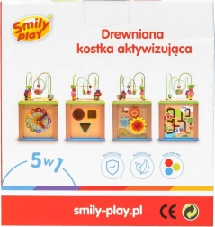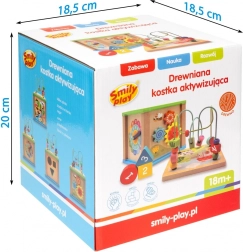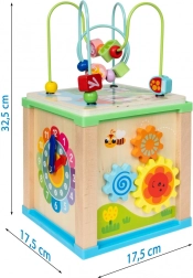 A gyöngylabirintus, az óra, az alakválogató, a csúszkálható elemek és a fonatok változatos játékot és tanulást kínálnak egyetlen fa kockában.