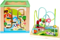 A Fa aktivitáskocka 5 az 1-ben tartalmaz egy gyöngylabirintust, mozgatható mutatókkal ellátott órát, akadálypályát farm témával, alakválogatót és átfűzős fonatokat a játékos tanuláshoz. Támogatja a finommotorikát, a kéz–szem koordinációt és a logikus gondolkodást, minőségi fából készül, nem mérgező festékekkel.