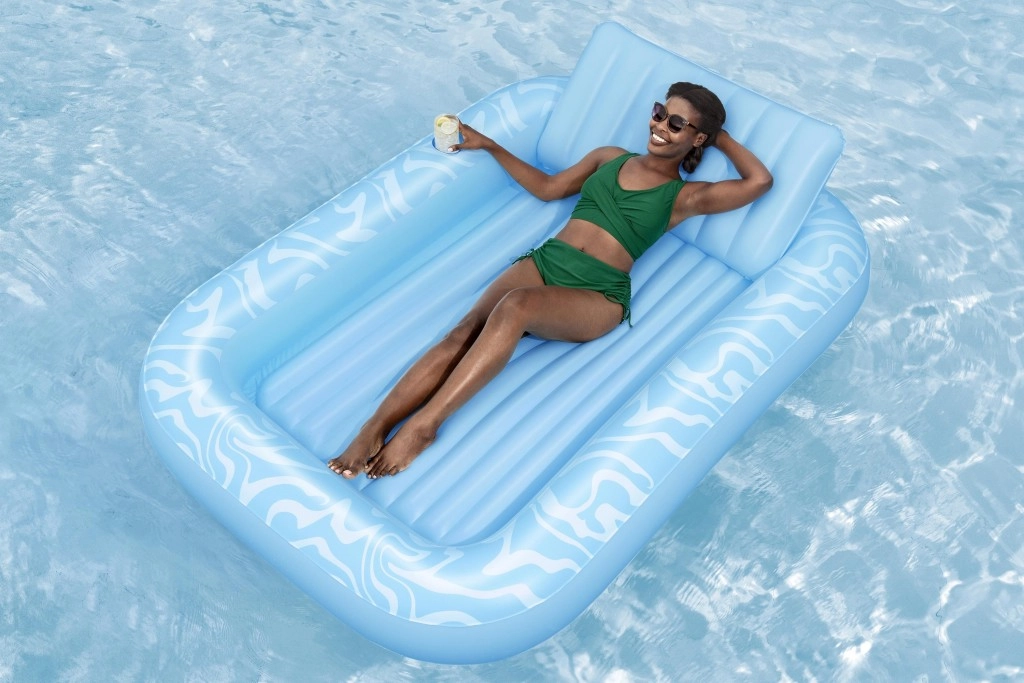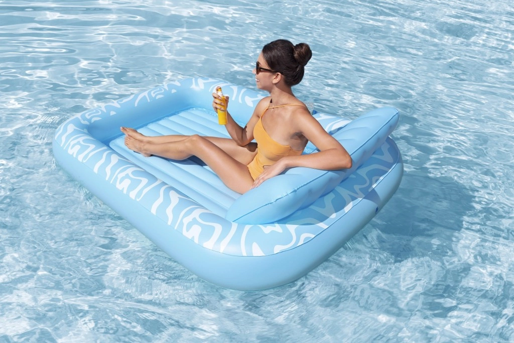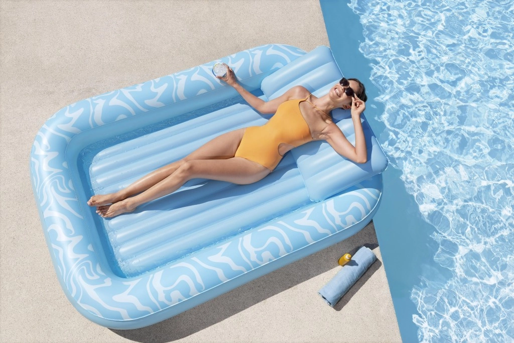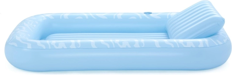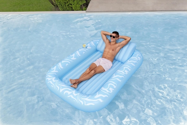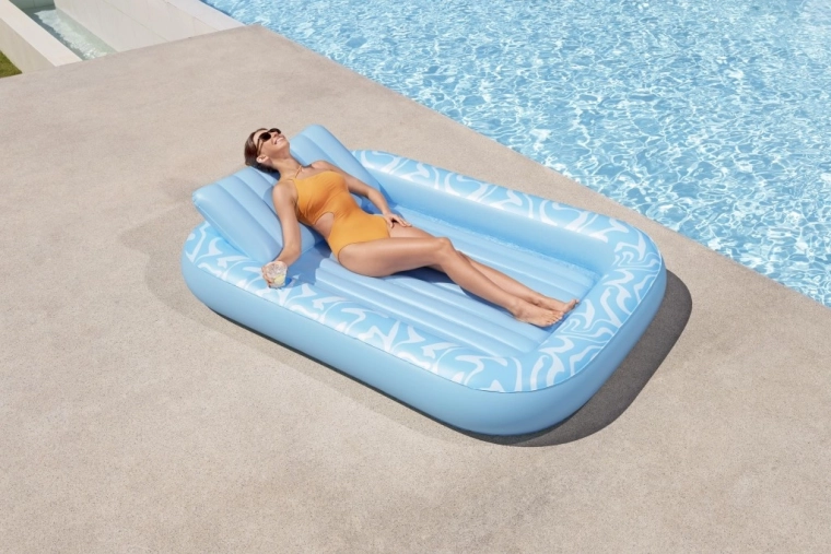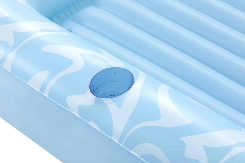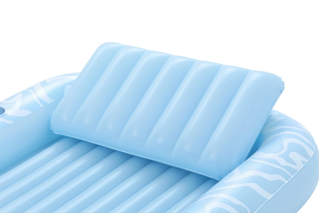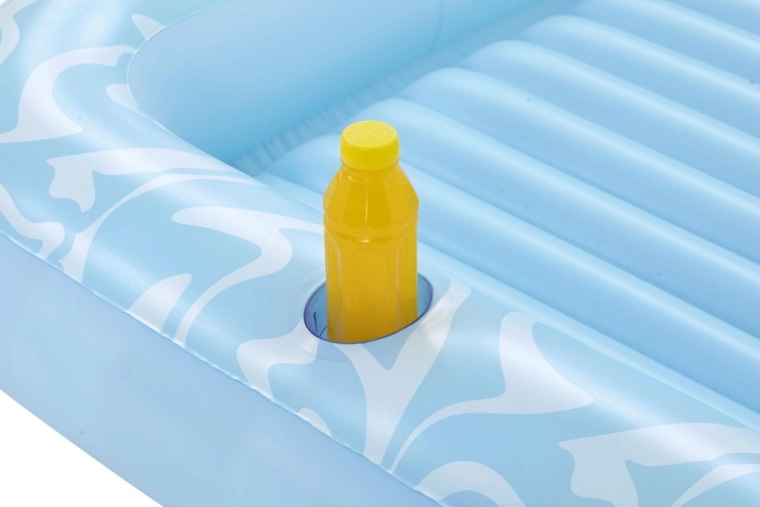 A Sun-Kissed matracot kényelmes pihenéshez tervezték medenceparton és a kertben. A széles, kontúrozott felület bordázott kialakítással kellemes alátámasztást nyújt a teljes testnek, a megemelt fejtámasz pedig kényelmet biztosít napozás vagy olvasás közben. A pohártartónak köszönhetően frissítő itala mindig kéznél lesz.