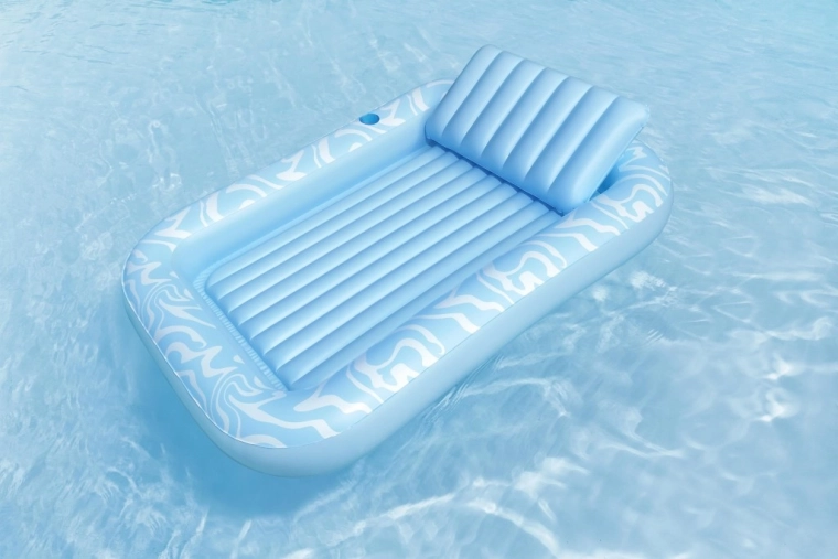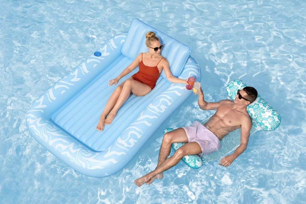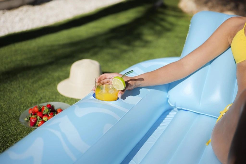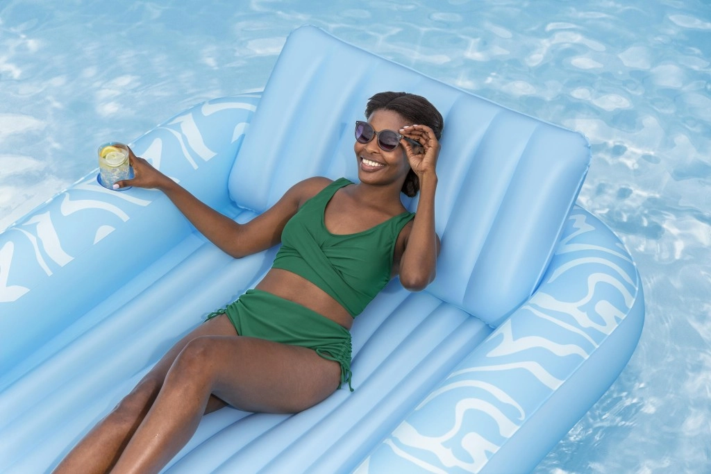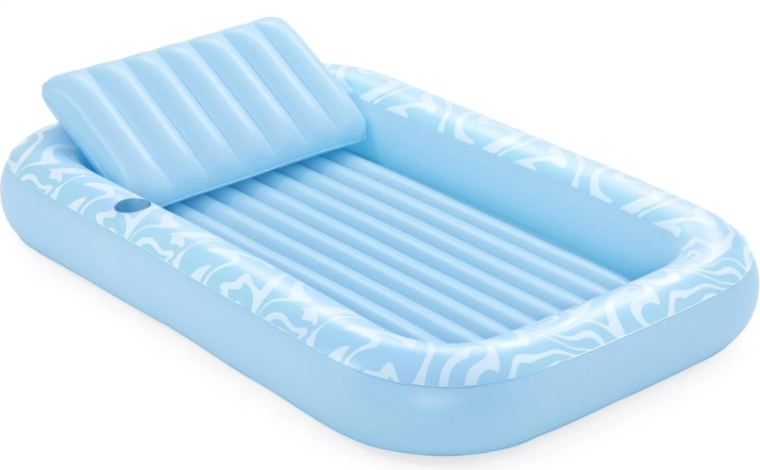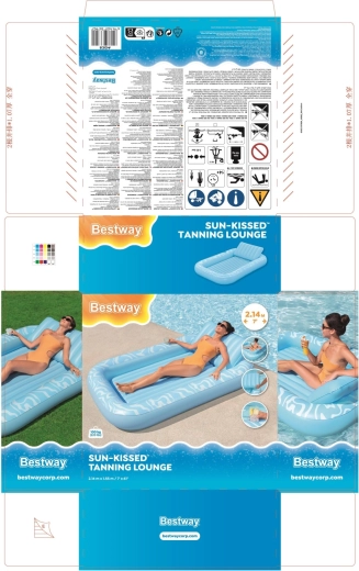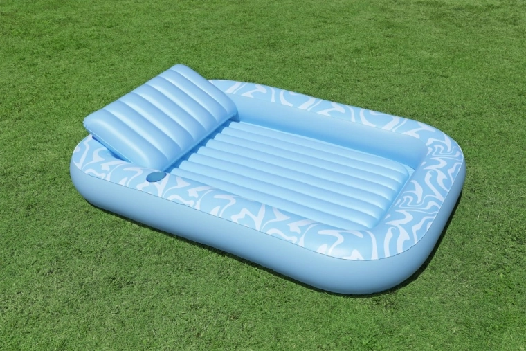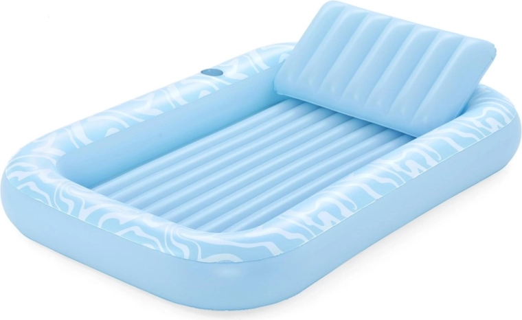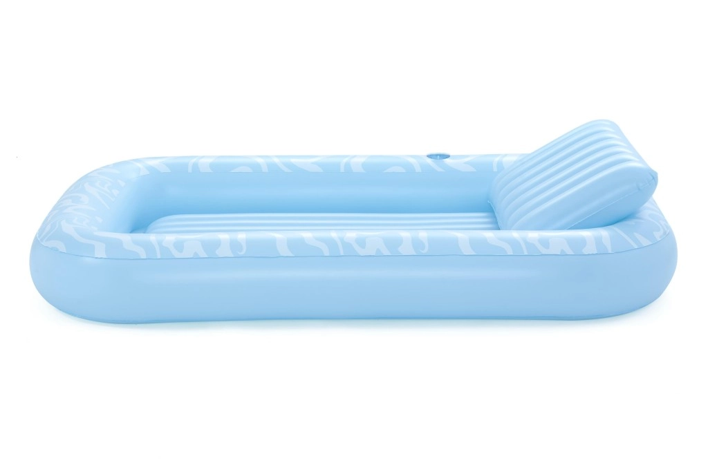 A Sun-Kissed matracot kényelmes pihenéshez tervezték medenceparton és a kertben. A széles, kontúrozott felület bordázott kialakítással kellemes alátámasztást nyújt a teljes testnek, a megemelt fejtámasz pedig kényelmet biztosít napozás vagy olvasás közben. A pohártartónak köszönhetően frissítő itala mindig kéznél lesz.