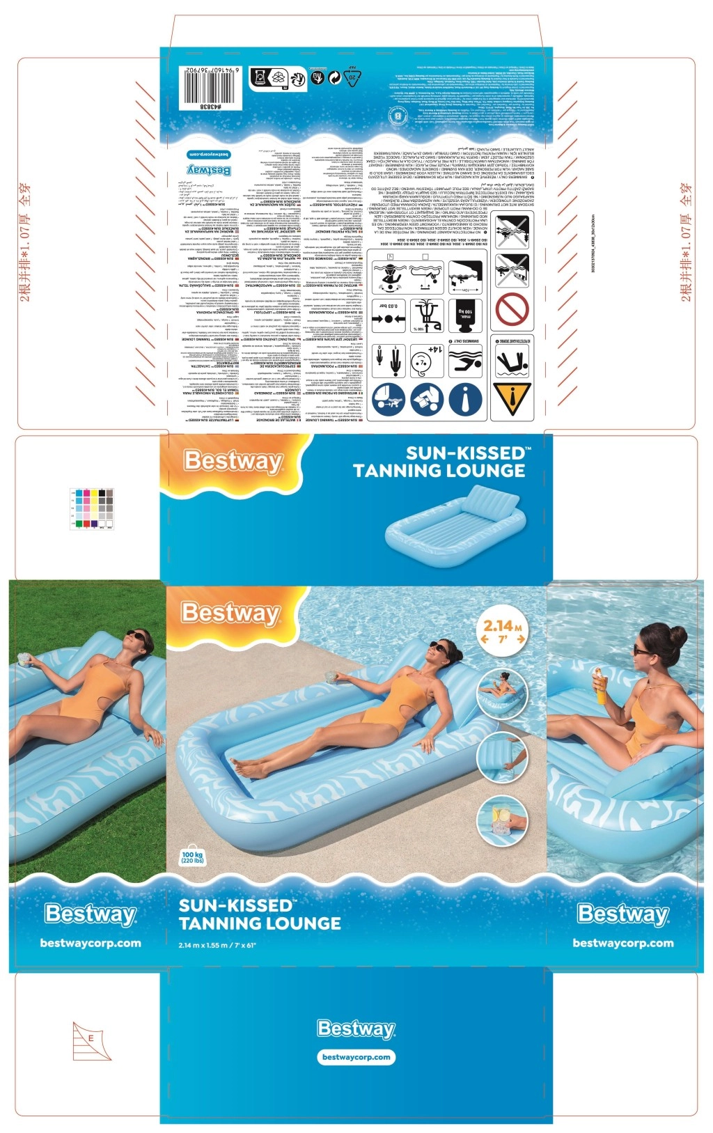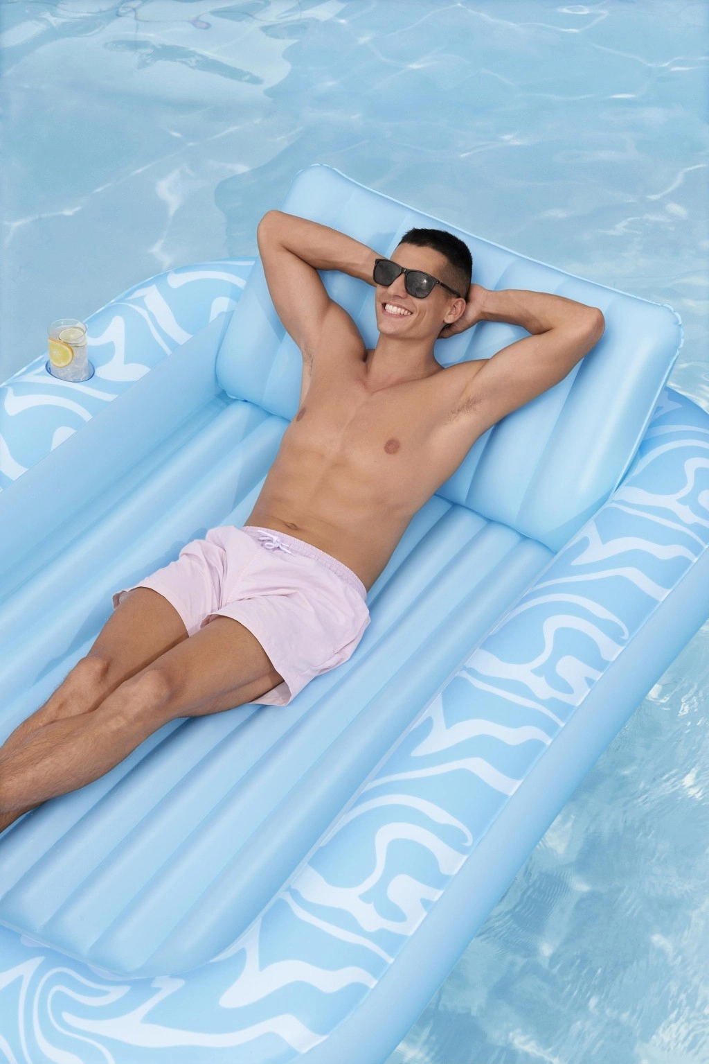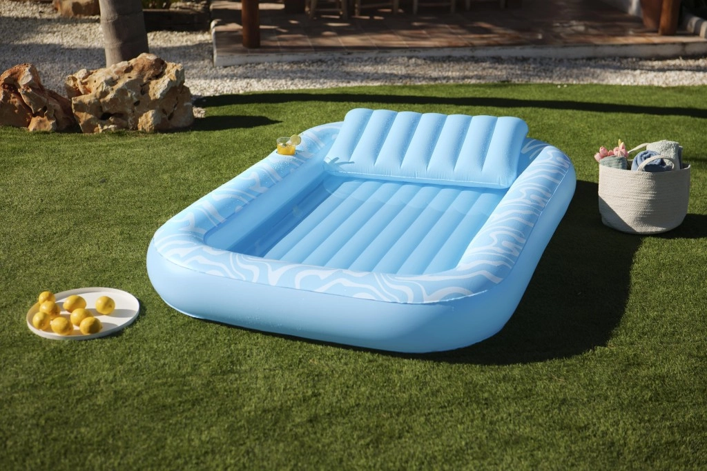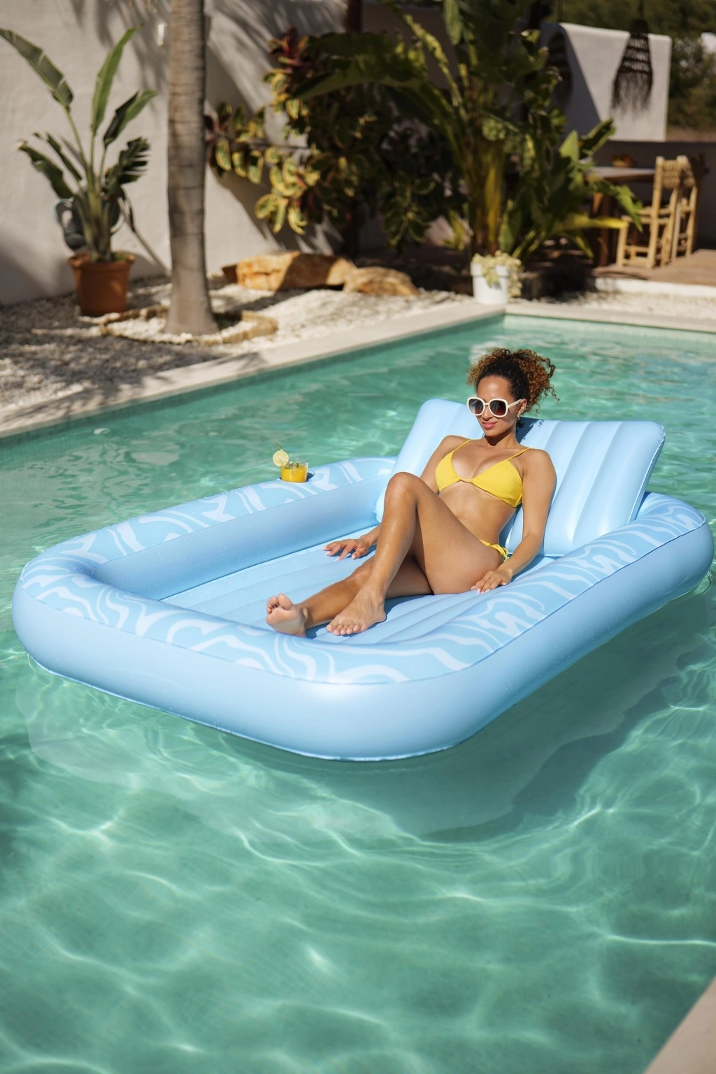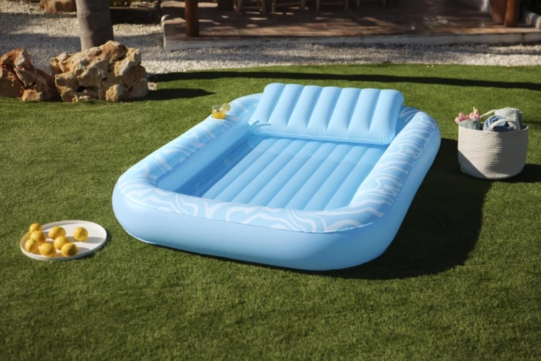 A Sun-Kissed matracot kényelmes pihenéshez tervezték medenceparton és a kertben. A széles, kontúrozott felület bordázott kialakítással kellemes alátámasztást nyújt a teljes testnek, a megemelt fejtámasz pedig kényelmet biztosít napozás vagy olvasás közben. A pohártartónak köszönhetően frissítő itala mindig kéznél lesz.