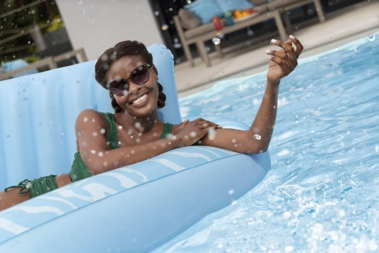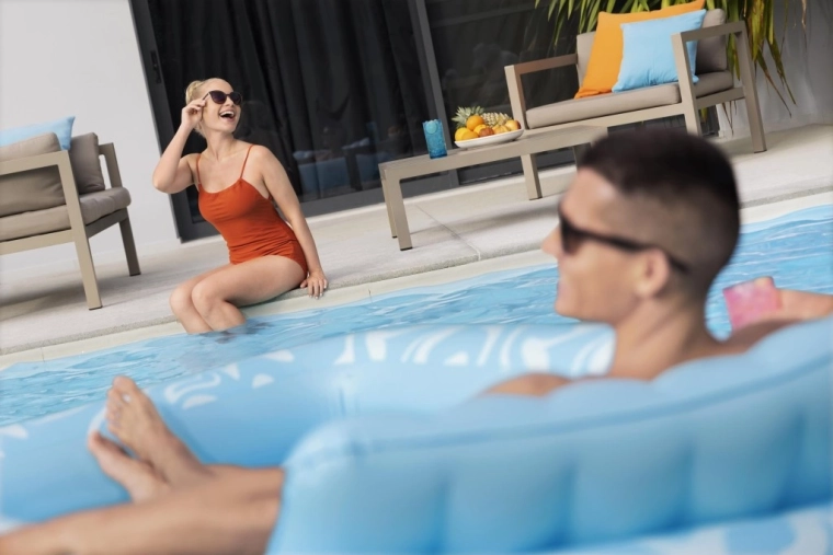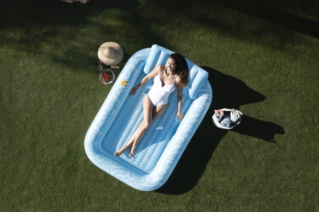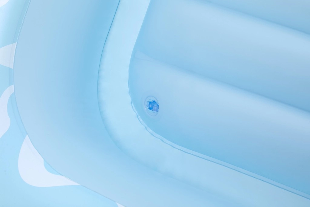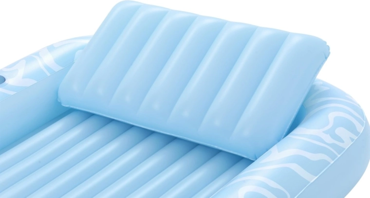 A megemelt, puhán megerősített fejtámasz tehermentesíti a nyakat és a vállakat, így hosszabb ideig relaxálhat kényelmetlenség nélkül – vízben és a parton is.
