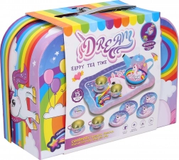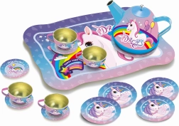 Stílusos teáskészlet unikornis motívummal, amely örömet visz minden gyerekes szerepjátékba. Masszív, fémből készült kivitelének köszönhetően a lelkes, mindennapos felszolgálást is bírja. A színes, fogantyús bőrönd megkönnyíti az összes darab egy helyen történő hordozását és tárolását.