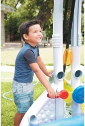 Fedezze fel a multifunkciós vízi központot, amely bármely kertet vagy gyerekszobát örömteli hellyé változtat. A gyerekek szabályozhatják a vízáramlást, megtölthetik a permetező tartályt, elindíthatják a kettős vízesést, és figyelhetik, ahogy a labdák a víz/golyó szállítón a felső vödörbe gurulnak. A felfújható alap növeli a biztonságot és a kényelmet játék közben.
