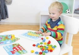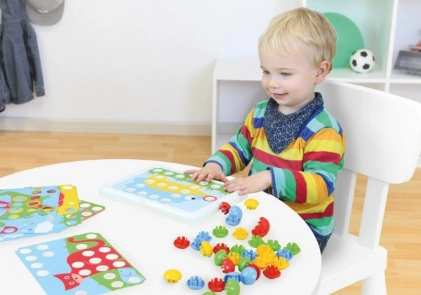 Ez a nagy, sima pöttyökkel ellátott mozaikjáték remek módja annak, hogy a gyerekeket játékosan támogassuk készségeik fejlesztésében. Az áttekinthető sablonoknak és a lyukacsos táblának köszönhetően a gyerekek szem–kéz koordinációt tanulnak, türelmet gyakorolnak és fantáziájukat fejlesztik. A nagy elemek jól kézben tarthatók és biztonságosan behelyezhetők.