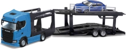 A többszintes félpótkocsi oldalkorláttal és felhajtó rámpákkal megkönnyíti a kis autók felrakását és szállítását – pont, mint a valóságban.