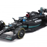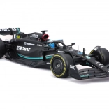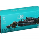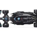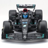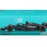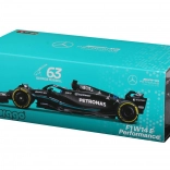 Hűen visszaadott formák, fényezés és a MERCEDES‑AMG PETRONAS F1 W14 (2023) szponzorlogói a 63-as rajtszámmal George Russell számára.