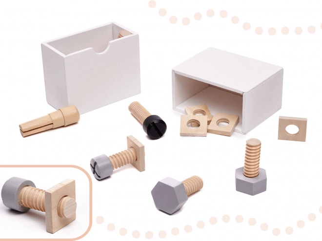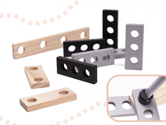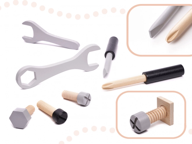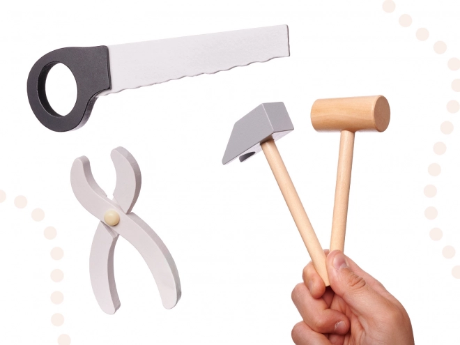 Nagy fa készlet, amely a kis barkácsolók álmait valósítja meg. Csavarhúzók, kalapács, csavarok, kulcsok - minden elem szükséges egy profi műhelyben. Gyerekeit óriási örömmel tölti el a korlátlan fúrás, szegek beverése és vágás lehetősége. A fogantyús fa doboz mobilissá teszi az egész készletet, így a gyerekek bárhová magukkal vihetik szerszámaikat bármilyen sürgős problémához.