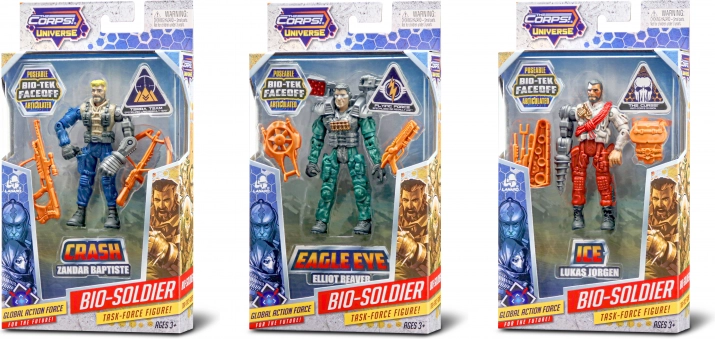 Fedezd fel az akciók világát a The Corps katonával fegyverekkel. Ez a 10 cm-es figura három különböző változatban érkezik: Crash, EagleEye és Ice. Minden változat egyedi tervezést és stílust kínál, ami lehetővé teszi a gyerekek számára, hogy belemerüljenek különféle kalandos és stratégiai játékszcenáriókba.