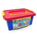 A piros fedelű és kék alapú doboz ideális a kockák tárolására és szállítására, így segíti a rend fenntartását.