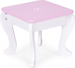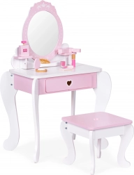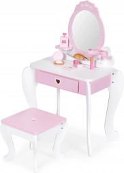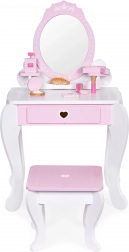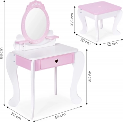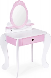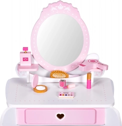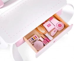 A toalett asztal biztonságos fa anyagból készült és úgy tervezték, hogy támogassa gyermekeik kézügyességének és fantáziájának fejlődését. Képessé teszi az alapsminkelési tudnivalók elsajátítását is. Praktikus tulajdonságok közé tartozik a kihúzható fiók és két polc, amelyek biztosítják a rendezett és tiszta asztalt.