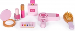 A toalett asztal játékokkal van felszerelve, mint például hajszárító, kefe, púdertartó applikátorral, árnyalat paletta, körömlakk, rúzs és parfümös üveg. Minden kiegészítő éles szélek nélkül készült, így teljesen biztonságosak a gyermekek számára.