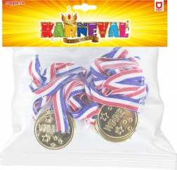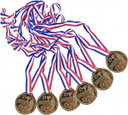 Adj örömöt minden kis győztesnek. A WINNER feliratú, csillagokkal díszített aranyérmek reprezentatív hatásúak, mégis biztonságosak és könnyűek a PVC anyagnak köszönhetően. A trikolór szalag kényelmes viseletet biztosít, és versenyeken vagy rendezvényeken könnyen kiosztható.