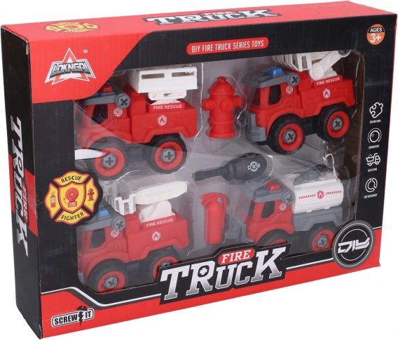 Ez a 4 csavarozható tűzoltóautóból álló készlet nagyszerű szórakozást nyújt és fejleszti a gyerekek motoros készségeit. Az autók minőségi műanyagból készültek, és úgy tervezték, hogy könnyen szétszerelhetők és újra összerakhatók legyenek.