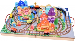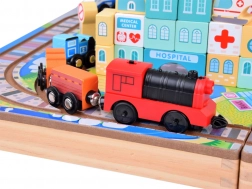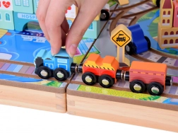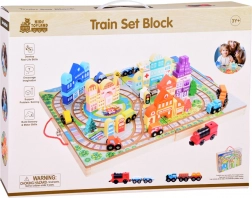 Fedezze fel a fa építmények lenyűgöző világát ezzel a fa városi készlettel, amely 89 szórakoztató elemmel büszkélkedik. A készlet tartalmaz síneket, elemes vonatokat és különféle színes blokkokat egyedi épületek megépítéséhez.