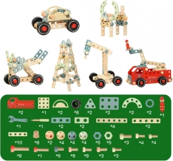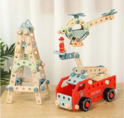 Merülj el az alkotás világában fa építőelemeinkkel, amelyek segítik a gyerekek kulcsfontosságú készségeinek fejlődését. Ez az oktató készlet lehetővé teszi különféle modellek megalkotását, mint például tűzoltóautók, repülőgépek, és egyéb kreatív formák.