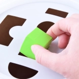 A készlet különböző formákat és színeket tartalmaz, amelyek segítik a gyerekeket a kéz- és szemkoordináció, valamint a színek és formák felismerésének fejlesztésében.