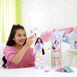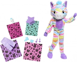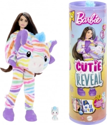 A BARBIE Cutie Reveal „Édes álmok” sorozat babája ötvözi a puha plüss jelmezt és a divatos játékot. A színes zebra jelmez stílusos öltözékké alakítható – beleértve a kétoldalas dzsekit virágmintával és szivárványos zebraminta-hatással. A dobozban cipő, sort és ékszerek is várnak a végtelen stílusmixeléshez.