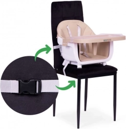 2 használati mód – otthon és útközben: Az etetőszék használható klasszikus magas székként, vagy a lábak eltávolítása után székfeltétként. A rögzítőpántok szilárdan a helyén tartják az ülést, így a gyermek bárhol biztonságosan étkezhet.