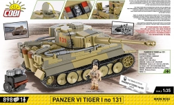 Építsd meg a legendás Panzer VI Tiger I sz. 131 tankot a népszerű 1:35 méretarányban. A COBI részletes modellje 898 elemet tartalmaz, forgatható toronnyal, állítható csővel és működő lánctalpakkal. Nem hiányzik a Maybach motor minimodellje, a nyitható nyílások, egy trópusi egyenruhás parancsnok figura és egy gyűjtői tábla a The Tank Museum logójával.