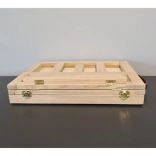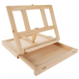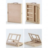 A fa anyagból készült bőrönd fiókkal és állvánnyal rendelkezik, ami megkönnyíti a művészeti eszközök szállítását és rendszerezését.