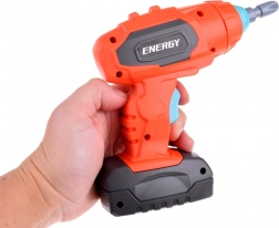 Könnyű, elemes csavarhúzó feltétekkel, amely a valódi szerszámokat utánozza, és önálló csavarozásra ösztönzi a gyerekeket.