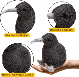 Ez a plüss kivi elegáns fekete színben, részletgazdag kialakítással készült – a hosszú csőr, a rövid lábak és a puha felület hűen adják vissza e különleges madár jellegzetességeit. A 17 cm-es kompakt magasság kényelmesen illeszkedik a gyerek kezébe, és kedvenc társsá válik játékhoz és alváshoz egyaránt.