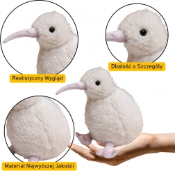 Aranyos, 21 cm magas plüss kiwi madár élethű dizájnnal és puha, kellemes tapintású anyaggal. Fehér kivitel, CE és EN71 tanúsítvánnyal 3 éves kortól biztonságos játékhoz. Remek ölelgetni való társ és dekoráció a gyerekszobába.