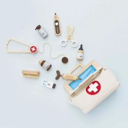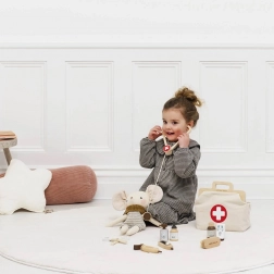 Ez az egyedülálló állatorvosi táska tartozékokkal ideális a kíváncsi kis állatorvosok számára. A készlet 10 darab eszközt tartalmaz, amelyek pácolt, FSC tanúsítvánnyal rendelkező természetes fából készültek, ezáltal ökológiai és fenntartható eredetűek. A gyerekek elmerülhetnek az állatgondozás világában a praktikus eszközöknek köszönhetően, mint a sztetoszkóp, az olló és a fecskendő. A táska célja, hogy támogassa a kreativitást és fejlessze a képzelőerőt.
