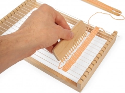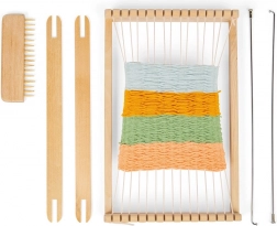 Tartalmaz minden szükséges eszközt és fonalat eredeti textíliák készítéséhez, beleértve a fa fésűt, csónakot és színes fonalakat.