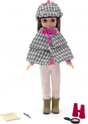 A baba felöltöztethető egy részletesen kidolgozott kockás poncsóba és sapkába, ami kiemeli a detektív témát.