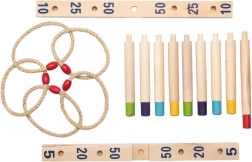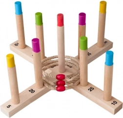 Tapasztaljon meg szórakozást a fa gyűrűdobós játékkal. A cél öt fonott kötélgyűrűt dobni a fa keresztre oszlopokkal és minél több pontot szerezni. Ez a játék nagyszerű az ügyesség, a türelem és a koncentráció fejlesztésére. A játék tartalmaz:
