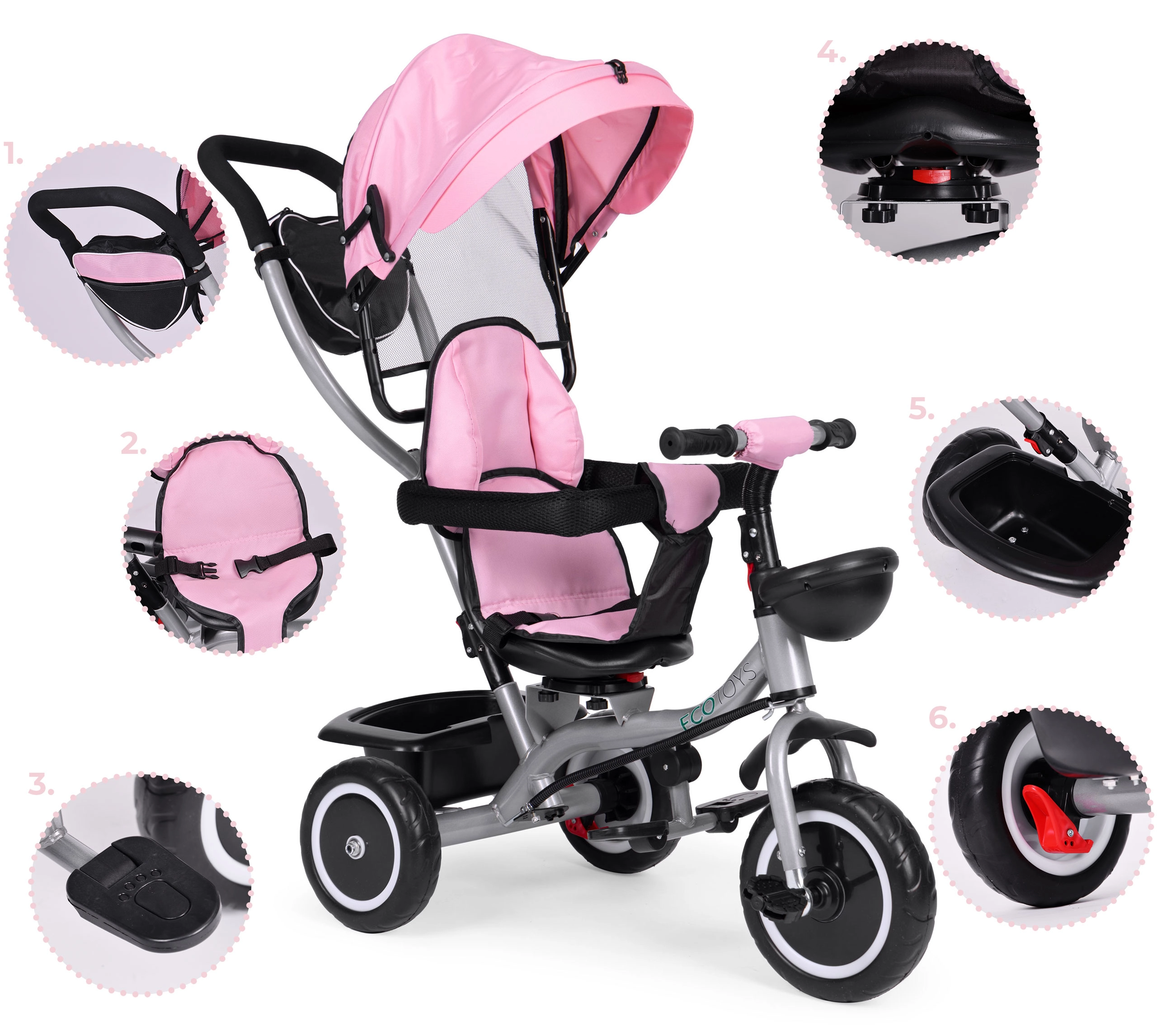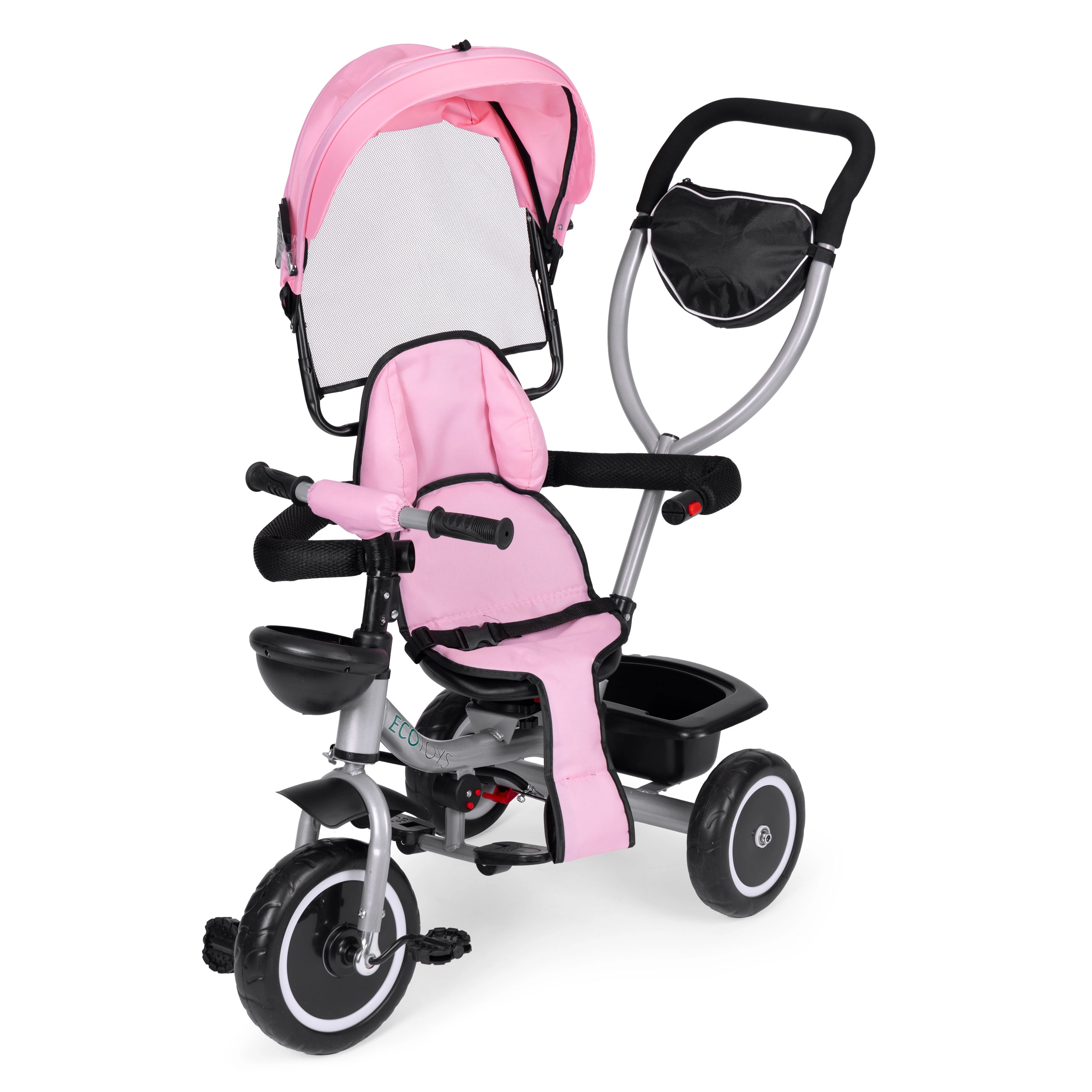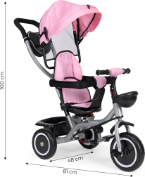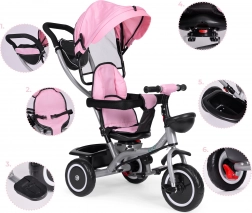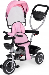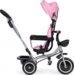 Életkor szerint könnyen eltávolíthatók az elemek (napellenző, karfa, vezetőrúd), így a tricikli a gyermek készségeihez igazítható. A praktikus kosarak és a cipzáras zseb elférnek játékoknak, kulacsnak és apróságoknak.