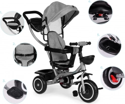 Az ECOTOYS tricikli együtt nő gyermekével – az első utaknál szülői irányítással, később pedig önálló pedálozással. A forgatható ülés lehetővé teszi a szülő felé vagy menetirányba néző utazást, az összecsukható napellenző véd a naptól és a széltől, a ötpontos övek elülső védőkorláttal pedig biztonságot adnak minden felületen.