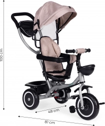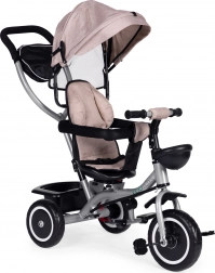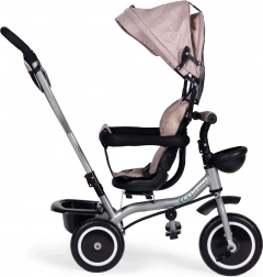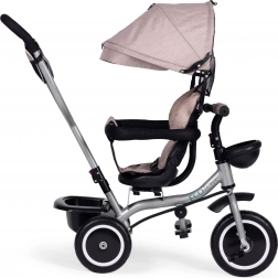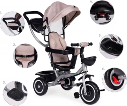A praktikus felszereltséghez tartozik a hátsó kosár, első kosár játékhoz és cipzáras zseb telefon vagy kulcsok számára. A kupola, a kapaszkodó és a tolókar fokozatos eltávolításával a tricikli alkalmazkodik a gyermek fejlődő készségeihez egészen az önálló hajtásig.