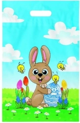 Húsvéti műanyag füllel ellátott szatyor ideális kiegészítő a vásárláshoz vagy a húsvéti ajándékok szállításához tágas méretének és erős anyagának köszönhetően.