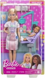 Játssz fogorvost Barbie-val és kis páciensével. A készlet tartalmaz egy fehér köpenyt, fogászati eszközöket és fogorvosi széket.