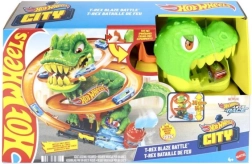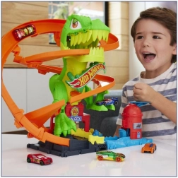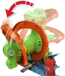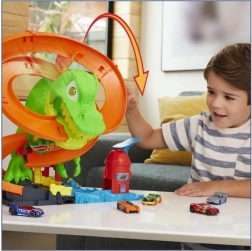 Készülj fel az izgalmas száguldásra a Hot Wheels Cityben! Indítsd el a mellékelt 1:64-es fém kisautót, és száguldj el a T-rex mellett. Minden egyes áthaladásnál a dinoszaurusz szemei forognak, míg végül elbukik. A gyerekek különféle forgatókönyveket próbálhatnak ki – a villámgyors tankolástól a hősies győzelemig, amely megmenti az egész várost.