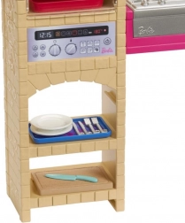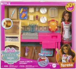 Ez a varázslatos konyhai szett Teresa babával valósághű főzést hoz a gyerekeknek BARBIE méretben. A gazdag felszerelésnek és az interaktív elemeknek köszönhetően, mint a funkcionális sütő forgó vezérlővel és a „sütés” színváltó sütikkel, vidám jelenetek születnek a tészta elkészítésétől egészen a tálalásig.