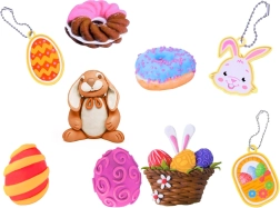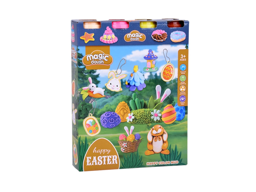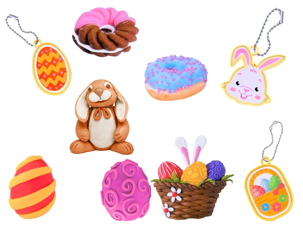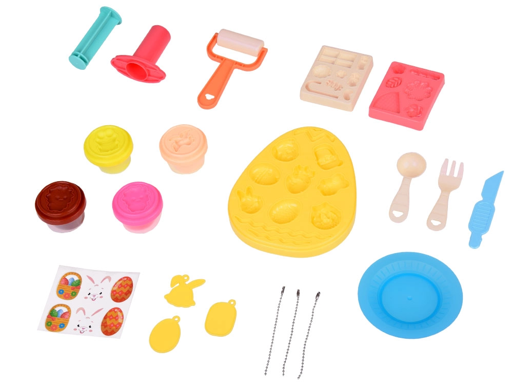 A nagy tojás nyuszi-, kosárka- és tojásmotívumokkal, valamint két további forma levelekkel és virágokkal lehetővé teszi, hogy a gyerekek sokféle gyurmadíszt készítsenek.