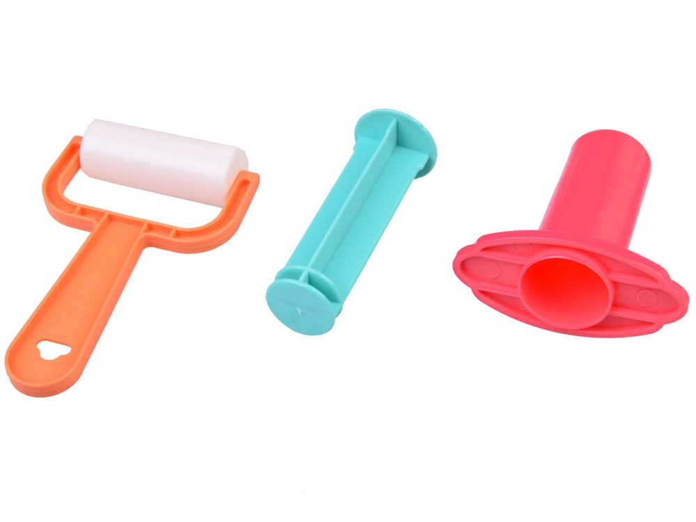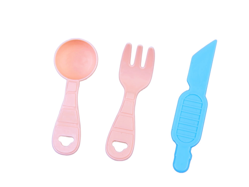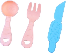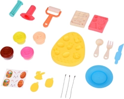 A nyújtó, a tányérka, a kés, a villa és a kanál támogatják a főzőcskézős játékot, és megkönnyítik a formázást és a kész alkotások tálalását.