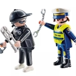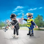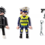 Tapasztald meg a rendőrök és bűnözők izgalmas világát a PLAYMOBIL rendőr és rabló figurakészlettel. Ebben a dinamikus páros készletben a rendőr, felfegyverkezve pisztollyal és bilincsekkel, készen áll elfogni a bűnözőt a tett helyszínén.