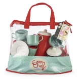 Ez a készlet ideális a kis házigazdáknak és háziasszonyoknak, akik szívesen rendeznek teázásokat vagy ebédeket barátaiknak és babáiknak. Könnyen hordozható az átlátszó, cipzáras záródású táskának köszönhetően, amely minden szükséges dolgot tartalmaz az étkezéshez.