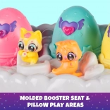 Éld át az egyedülálló kikelési pillanatot a Hatchimals Felhő neon szivárvánnyal többcsomagos szettel. Csak húzd ki a cumikat a tojásokból, töltsd meg a cumisüveget vízzel, és óvatosan nyomj egy keveset a tojásokba – pár másodpercen belül megjelennek az új figurák: Bunnypie, Puppadee és Narwing. A tojáson kívül Kittingale és Foxstritch is rád vár. Mindet kiállíthatod a tavaszi kosárban, kialakított üléssel és párnával.