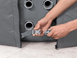 Az állítható, csatos pánt tökéletes illeszkedést biztosít, a cipzár pedig lehetővé teszi a beépített és a külső szivattyú csatlakoztatását a fedél levétele nélkül.