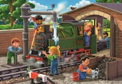 A gyerekek választhatnak a nyüzsgő műhely modellrepülővel és az életteli fűtőház gőzmozdonnyal témák közül. Mindkét kép rengeteg felfedeznivaló részletet kínál.
